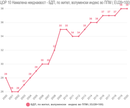 ЦОР 10 Намалена нееднаквост – БДП, по жител, волуменски индекс во ППМ ( EU28=100)
