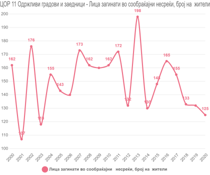 ЦОР 11 Одржливи градови и заедници – Лица загинати во сообраќајни несреќи, број на  жители