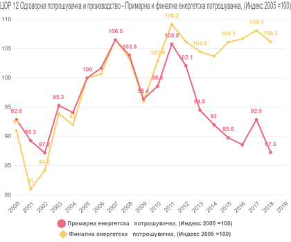 ЦОР 12 Одговорна потрошувачка и производство – Примарна и финална енергетска потрошувачка, (Индекс 2005 =100)