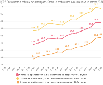 ЦОР 8 Достоинствена работа и економски раст – Стапка на вработеност, % на население на возраст 20-64