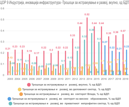 ЦОР 9 Индустрија, иновација инфраструктура -Трошоци за истражување и развој, вкупно, од БДП